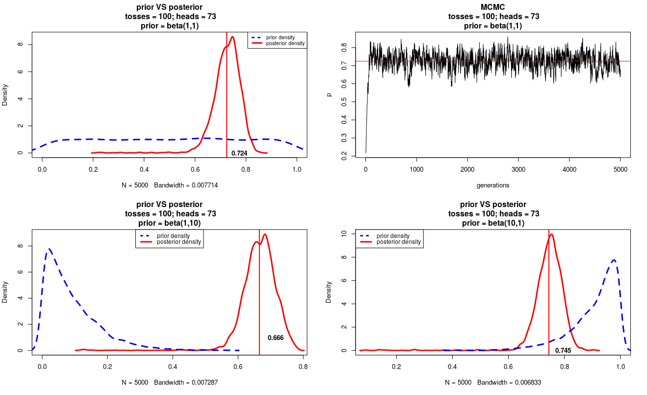 You can play with the code and explorewith a different number of tosses, or the effect of a different prior for p...
